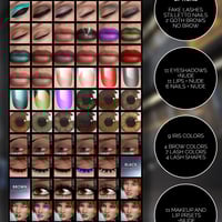 Lots of options, including nine eye colors, 11 lipsticks and makeups, and 7 different fingernails, plus, there are twelve presets that include makeup, and lips for an easy quick start solution. Unique features include buttons for Anatomical Elements, 6 LIE eyebrows, and a No Brow face texture.