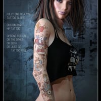 Stormy is an outrageous girl. With sexy makeup and tattoo options, she will add a great touch to any render. Many hours of loving attention went into the skin and it's unique detailed artwork. The skin was creating from high-res photos, no merchant resources were used. It includes a full tattoo sleeve of the right arm and small tattoo on the right hip. All the textures use the Genesis 3 Female UV. Options include eight eye colors plus, ten makeups/lipsticks and eleven nail designs. As always, there are eleven presets that include makeup, nails, and lips for an easy all-in-one solution. Tattoo Buttons allow for arm, hip, both or no tattoos options.