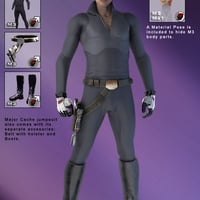 Ask me if I care.'Major Cache is a conforming clothing and prop set for Michael Version 3. The package includes 10 conforming items, two props, and Material Poses. The conforming items are armor for the chest, legs, arms, shoulder, and hip. Also included are gloves, helmet, jumpsuit, ranger coat, side pistol holster, and a pair of boots. Props include a hand gun (pistol) and rifle.