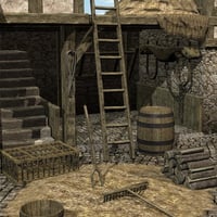A detailed medieval barn with various tools and accessories, perfect for your medieval and fantasy renders. Included are a posable wagon, a barrel, a bucket, a chicken crate, firewood, a collection of stable tools, and even a hay pile. DAZ Studio materials are also included, so the barn works in your rendering program of choice.