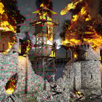 Fireballs and flaming arrows arc through a smoke-filled sky, crashing into the wooden defenses protecting the castle ramparts, setting everything alight in a fiery inferno. Cries emanate from the watch tower, warning those below, as the cargo lift hoists massive stone blocks up to the parapet where they are hurled down upon the attacking enemy below.