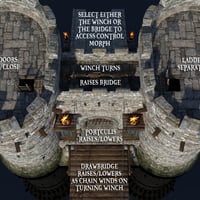 Of course, the centerpiece to any decent castle access gate is its moat and drawbridge. Here, a sturdy oaken plank bridge crosses a broad ten-meter span, fully-rigged with a 60-bone set of chains that wrap around a heavy dual-handled winch mounted up on the parapet. Selecting either the Bridge itself, or the axle of the Winch will give you a dial labeled "Raise Drawbridge" that is rigged to do just that, cutting off the castle entry to unwanted guests.