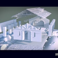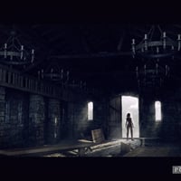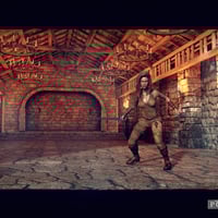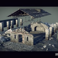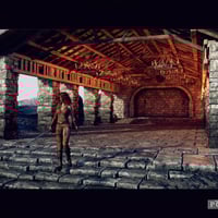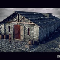 A realistic fantasy medieval dinner hall with exterior and interior scene and lights included.