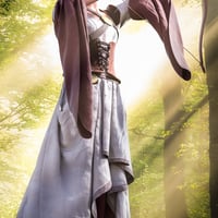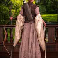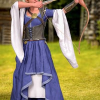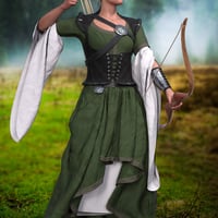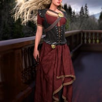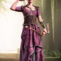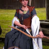 The dForce Medieval Style Outfit for Genesis 9 contains the upper skirt, lower skirt, shirt, sleeves, corset, bow, arrow, bow bag, shoes, stocking, and hand armor with a variety of different textures and colors.