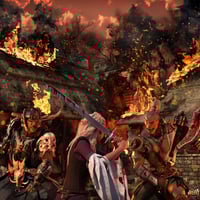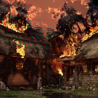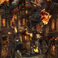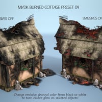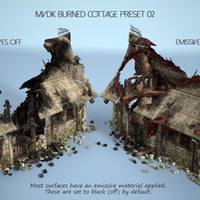 All wood, plaster, and roofing surfaces have emissive materials that can be turned on or off to produce luminous glowing devastation or dark soot-stained ruins.