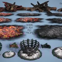 But that's just the start! Scores of scattered stone and burned wood debris props, included both as static and dynamic Fisio simulation presets, allow you to fill your scene with appropriate levels of matching ash and scattered rubble piles for a more realistic feel.