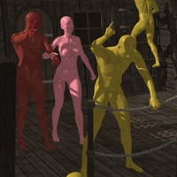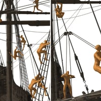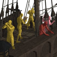 All poses will position the sailors in precise locations, as shown. All 40 poses can be used in one scene. Deckhands can be easily relocated about the ship. Topmen can be moved to other spots and more can be added.