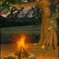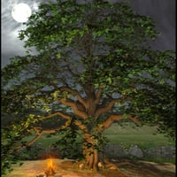 Merlin's Oak has sheltered many a wandering soul on a cold, wet night; it's low hanging boughs protecting all who huddle beneath it's mighty shadow. It's ancient branches reach out, as if to warm themselves on the camp fire below, but ever wary of the dancing flames.