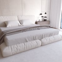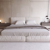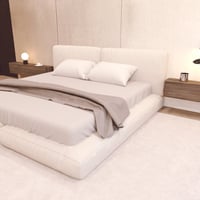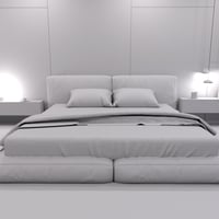 It includes a stylish modern large Bed, Lamps, and other props in the scene.