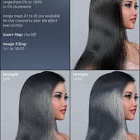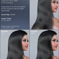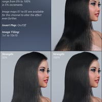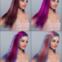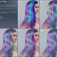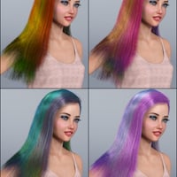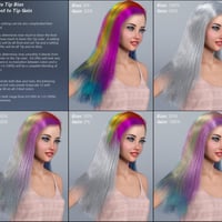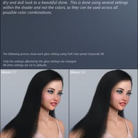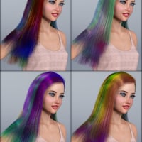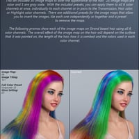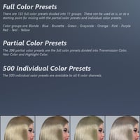 There are 132 full colors presets for realistic and fantasy hair colors. 396 partial color presets derived from the full color presets. There is also 500 color presets for each individual color channel. These can all be mixed as you see fit. 30 image maps are available for each color channel that can be applied individually or in groups. 10 Gloss settings are provided to give you everything from a flat dull look to a beautiful shine.