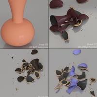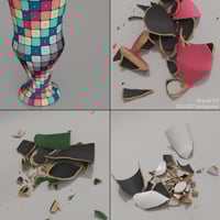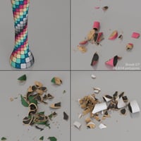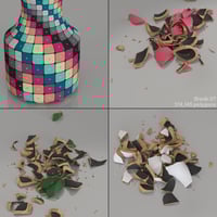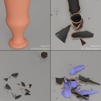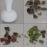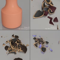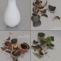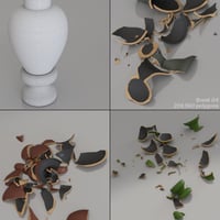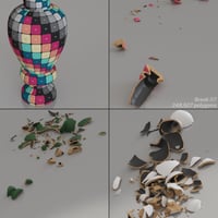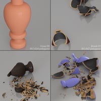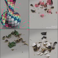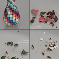 This set includes 6 vases and 54 broken vase props. For each of the 6 vases, there are 9 different breaks, each is the final stage of the break. Each break is technically settled, but some of the smaller pieces might not be directly in contact with the ground or the piece they are sitting on. The different breaks vary in how much they spread out from vase to vase, and either scatter a little or a lot. The promos may not capture the entirety of each break due to how much the pieces spread out. There are 11 full glass presets, 10 full porcelain color presets, 10 full glass with a painted interior presets and 67 partial material presets for the 3 surfaces. 20 frosted glass presets for the interior and outside surfaces are also included.