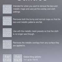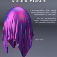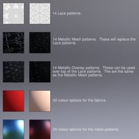 This is a set of shader presets designed for fabrics that can be mixed with itself or other shader sets. There are 14 lace patterns, 14 metallic mesh patterns and 14 presets to use the metallic patterns as an overlay. It includes 30 fabric colors and 20 metallic colors. There are also 10 global tiling presets and 4 other presets that will selectively remove certain maps.