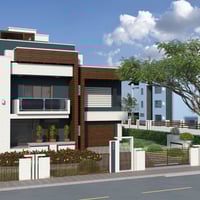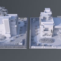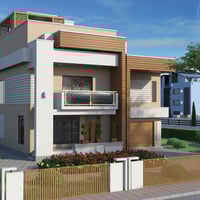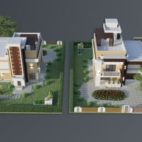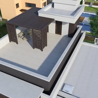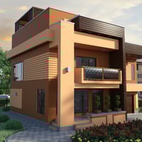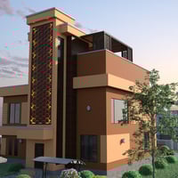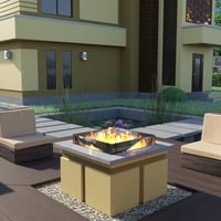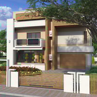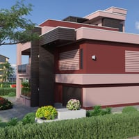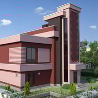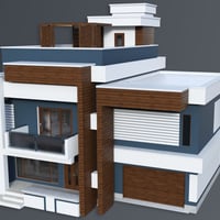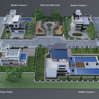 Modern House 4 is a contemporary two-story house with a balcony and a garage for two cars. The set includes a house and a fenced area, plus sofa, tables, chairs, fireplace, flower bed plants, and acacia tree props. The set includes six paint colors.