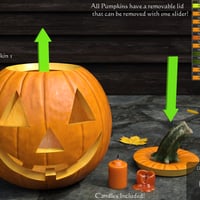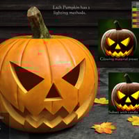 This set of 5 highly detailed morphing Jack-O-Lanterns are perfect for Halloween renders as they are the quintessential holiday decoration. These guys are fully rigged so positioning the lid is easy, each pumpkin also has many shape changing morphs so you are not limited to the 5 pumpkin shapes alone, they each come with 2 unique methods of illumination and although they load into the scene with Iray materials they also have 3Delight equivalent material presets provided.