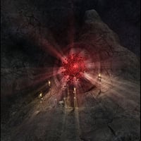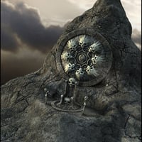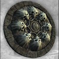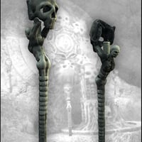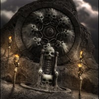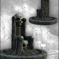 Mort Augur is a fantasy-themed 3D assembly, featuring a large skull-encrusted wall design set into a free-form rock formation. It includes an organic skull throne and candle holders, along with a 180-degree stone background wall section.