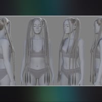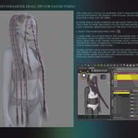 The hair contains a wide range of morphs and parameter dials to assist with fit, styling, posing and movement. The hair includes 25 colors for the braids and 25 colors for individual braid strands plus 11 gloss settings.