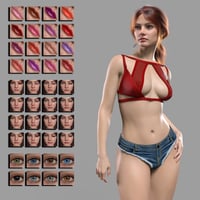 Francesca comes with custom face and body shape, HD details, PBR and Uber materials, 16 L.I.E. lip colors, 16 L.I.E. makeup options, 8 eye colors, 8K normal maps, and 4 custom expressions.