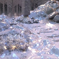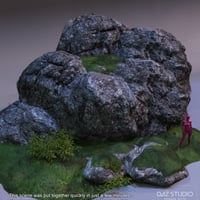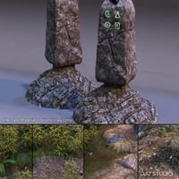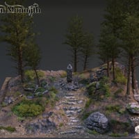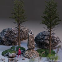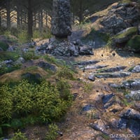 This is a modular woodland terrain set that includes at its core two high detail terrain pieces, one with pine trees and one without. Both have integrated plantlife, rocks, moss, and stone steps, but the set also includes a variety of modular props so that you can customize the terrain pieces or create your own from scratch. Large rock outcroppings, a standalone monolith, pine trees, rubble, grass, ferns and plantlife and forest billboards are yours to use as you please.
