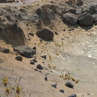 You don't have to be an advanced user to appreciate what this set can offer. Novices can easily make use of the three sample terrains simply by putting them into a scene and rendering away. The included sample terrains are large, multipart models with hideable components such as rocks, grass, and vegetation. While each terrain can fill a scene by itself, they also tile seamlessly along the X and Z axis if you have need of truly mammoth landscapes. With a rocky hill, a desert, and a frozen muddy riverbed, you don't even have to dip your toes into the shader work to add a lot of value to your renders.