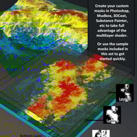Content creators can take full advantage of what the multilayer shader offers by creating custom masks using software such as Photoshop or Substance Painter and blending tiling textures across any model that has UV maps. Imagine taking ambient occlusion, altitude, and height maps and creating extremely detailed terrain textures. Merchant Resource versions of the shaders are included as well as a guide in pdf format.