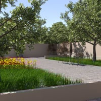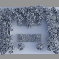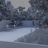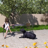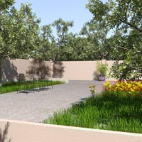 This outdoor setting includes an area partially fenced-off with a brick wall to keep your characters private as they admire the beautiful plants and trees in the garden.
