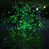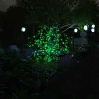 At night, crystals embedded in sticks illuminate the place and luminous creatures fly around the garden, making the environment magical.