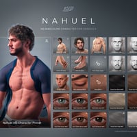 Nahuel features include an HD head and body structure, HD hands and feet morphs, FiberMesh eyebrows and multiple beard props, a dynamic male anatomical elements shape, hyper-realistic skin, and a wide range of eye color materials.