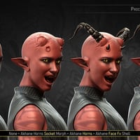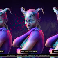 "NDFP Akhane Horns" expands upon NDFP Akhane's demon concept by providing two sets of horns loaded together with socket morphs to help their placement and a Geoshells to apply a texture transition that ranges from subtle to savage.
