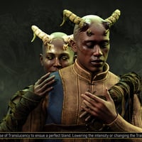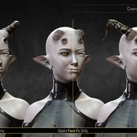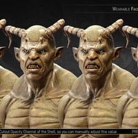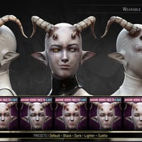 Face Fx Geoshell Wearable | This Geoshell is set up to provide a transition between the underlying skin of your character and the Horns for a non-destructive and flexible workflow. These H.MATs should work on any G9 character. Like the Horns, we provide 17 matching Hierarchical Material Preset (three styles plus variations). Two Styles come with alternate transition masks (seven Hierarchical Mask Presets in total) for even more variation. And to help with the blending, we included four Intensity Presets to help you control the opacity of the shell, which is helpful for more subtle approaches.