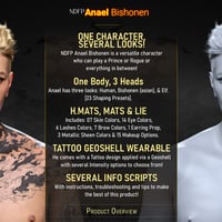 Anael Bishonen is a versatile character, capable of embodying a range of roles and personas. His three distinct looks-human, bishonen, and elf-provide a canvas for your creativity, allowing you to insert him into different stories, genres, and situations with ease.