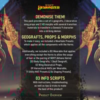 That said, Demonizer was created as a sister product of NDFP Akhane Horns. As such, the textures and looks match those of our other products, allowing you to mix and match both products for alternate looks. A tutorial (also included as a promo) is supplied to help you navigate using both products together. A property preset will help you adapt Akhane Horns Face Fx to use with the Demonizer.