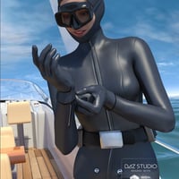 They come with six styles that fit both the modern freediver and the vintage wetsuit, but can be used independently as well. Included are also materials for the new Iray render engine. A prop version makes this set complete.