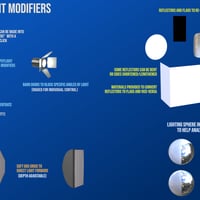 Light Modifiers are also included to guide the light in your scene. Some work well to block light or reflect it, providing some fill light without an extra light emitter. Others will conform to some of the light emitters to block or change the shape of the light, directing it to where you'd like it to go.