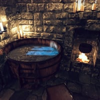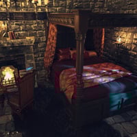 It includes the stone castle bedroom along with a queen bed, a wooden bathtub, a fireplace, and all the furniture and props you can find in a bedroom, which all are ready to render in Iray.