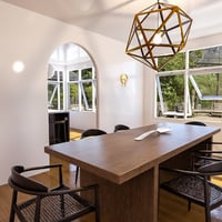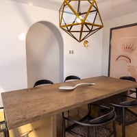 The fridge is hidden inside the cabinets to make the place seamless lookingnd passing through the dining room arches, you find a beautiful wood table and custom chairs. The dining area screams elegance especially with those gold details from the chandelier to sconces.