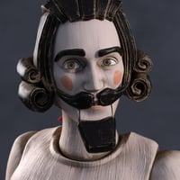 Conforming facial hair and brows, as well as a hand-carved period hairdo, work to complete the look alongside iconic nutcracker teeth.