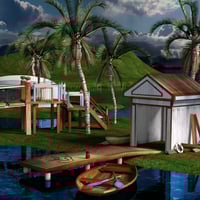 Ocean Dwellings is a complete self contained environment with an Ocean-House, Jetty, Boat, Islands, Palms, Hi Resolution Trees, Bridges, Rocks, Bunker and Ocean Water.