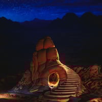 A solitary stone house stands weathered by centuries of desert winds, its plain walls glowing beneath Ra’s relentless sun.