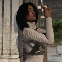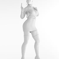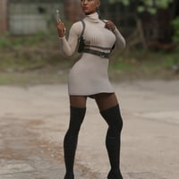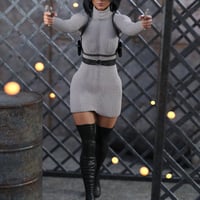 This Outfit Kit comes complete with mid-thigh turtleneck sweater-dress, panties, arrow themed hoop earrings, slick stiletto boots, belt, and gear harness with holsters to house her shiny M1911 pistols.