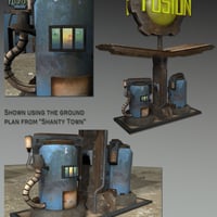 Build your own city on the edge of nothing. The OutPost Fusion Staion 3D landscape set gives us a look at the outlands, but how are we going to gas up our rides? The Fusion Station is green energy … maybe toxic, but green. This two-part 3D Daz set will help you build a believable outpost in the wastelands. The station door opens and the station’s interior space is textured, but still waiting for the furniture truck to arrive. Works with any ground plane, and plays nice with others. Fusion station pumps and 3D lighting for fushion stations are included.