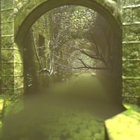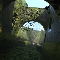 Moss-covered masonry forms a tunnel-like structure, softened by years of moisture and time.