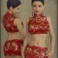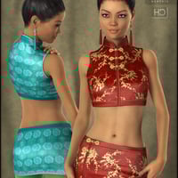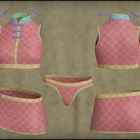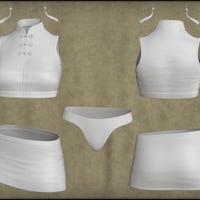 Four conforming clothing figures: top, skirt, panties, and earrings. The earrings have 12 extra bones for positioning and posing, pose controls are included for easy movement of the tassels. The skirt auto-follows the legs.