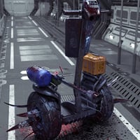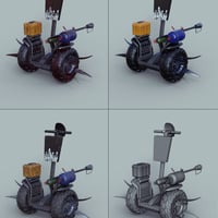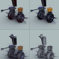Additional props for your apocalyptic or sci-fi renders are included, consisting of a flame thrower, wheel blades, and a storage box.