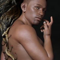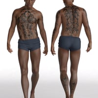 He has dark skin with options to have painted brows and/or painted scruff, with fibermesh wearables to enhance that look. Or you can use the No Brow and No Scruff head textures. Jayson's body can further be modified by elaborate tattoos for the front and back of his torso in addition to his arms and legs. And there are 7 eye colors to choose from.