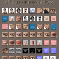 There are many choices available for her, including six subtle eye colors in blue, green and brown, makeup options such as a foundation to even her facial skin and somewhat conceal her freckles and moles, three blush choices, six eyeshadows with the option of adding a metallic finish to them, ten lipsticks with options to increase shine/gloss, eleven nail polishes with options to add glitter and glossy effects, four eyeliner styles that can be worn alone or layered on top of the eyeshadows, painted brows and no brow face textures, torso LIE tattoo, and optional female anatomical textures for both her torso and the female anatomical elements.