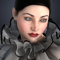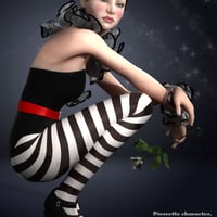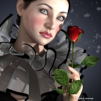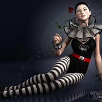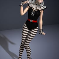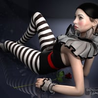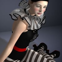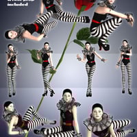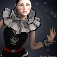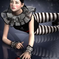 Pierrette is a complete Genesis 2 Female(s) character with her unique custom head morph dial, body morph dial, fair skin, cap with hair, frilly neck collar, frilly wrist cuffs, one piece suit with shoes, rose prop and poses.