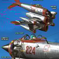 Pitchulin 15, codenamed JetHog is a heavy dieselstyle fighter equipped with a pair of jet engines located in a vertical configuration. As standard, it is designed for one pilot and equipped with a pair of 23 mm cannons. It is available in several versions according to the purpose of the combat mission, either with a conventional radar in a conical tip, or with an extended radar, with four machine guns caliber 9 mm or with a rotary anti-tank cannon caliber 37 mm. The aircraft excels in high speed and durability, however, due to the unusual layout, it requires experienced pilots.