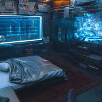 The room is filled with sci-fi panels, glowing screens, and layered tech elements that create a lived-in, high-tech vibe.