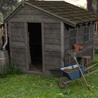This 3D building collection for Poser and DAZ Studio includes a charming wooden shed fully stocked with gardening tools and wheelbarrow. With a simple toggle switch you can change the shed from an open to closed style.