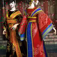The set comes with underdress, overdress, drapings, belt and shoes. These items can be used all together or in different combinations. The dresses have special rigging to adjust the wide sleeves to many different poses. There are also special morphs to adjust the skirts better to the poses and for special shaping effects. This set also includes two versions of the drapings: one that can be worn over the dresses and one that is skin-tight and will fit snugly if used without the dresses underneath. The drapings have easy-pose dials for quick posing. Two beautiful texture sets make it easy to mix-and-match.